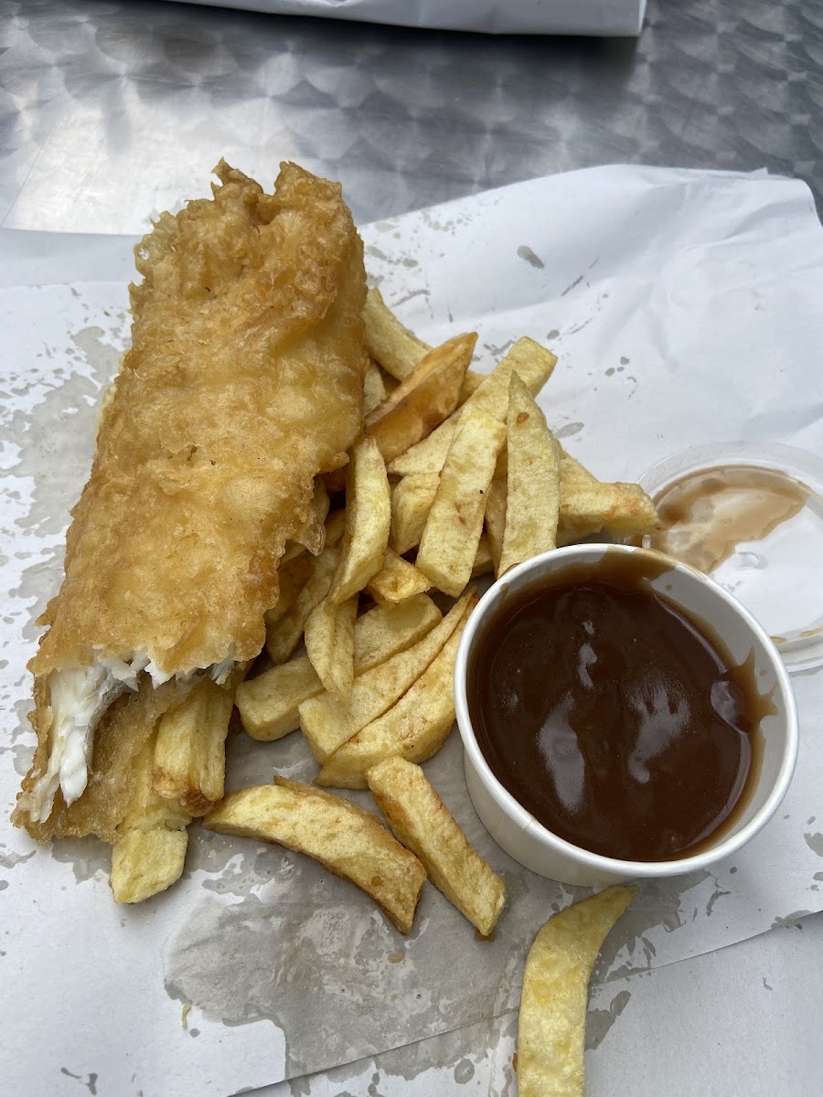 The menu focuses on traditional fish and chips, yet there’s enough variety to keep things interesting. On my visit, the Fish and Chips with Mushy Peas immediately stood out. The fish arrived wrapped and piping hot, with a crisp golden batter that cracked lightly with each bite. Inside, the fish stayed flaky and tender. Paired with soft mushy peas, it felt like a classic done right. Alongside the meal, a simple tea mug rounded out the experience in a way that felt very familiar and comforting.